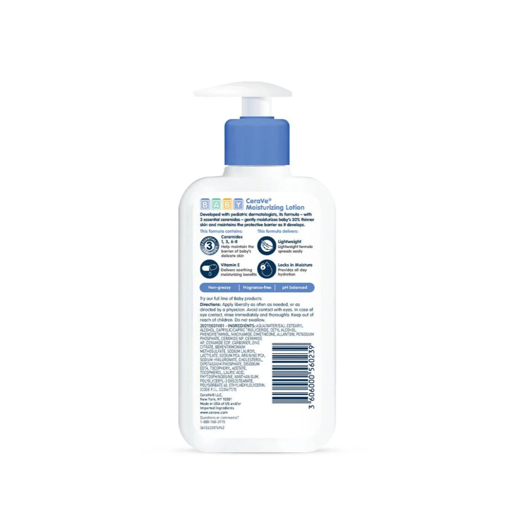 Cerave Baby Moisturizing Lotion is a gentle, hydrating lotion designed specifically for the delicate skin of babies. Formulated with essential ceramides, glycerin, and hyaluronic acid, this lotion helps to lock in moisture and provide long-lasting hydration. It is formulated without fragrances or parabens, making it ideal for sensitive skin. This lotion helps to restore and maintain the skin's protective barrier, keeping it soft and supple. Enriched with the natural goodness of ingredients that soothe and nourish, it's perfect for daily use.