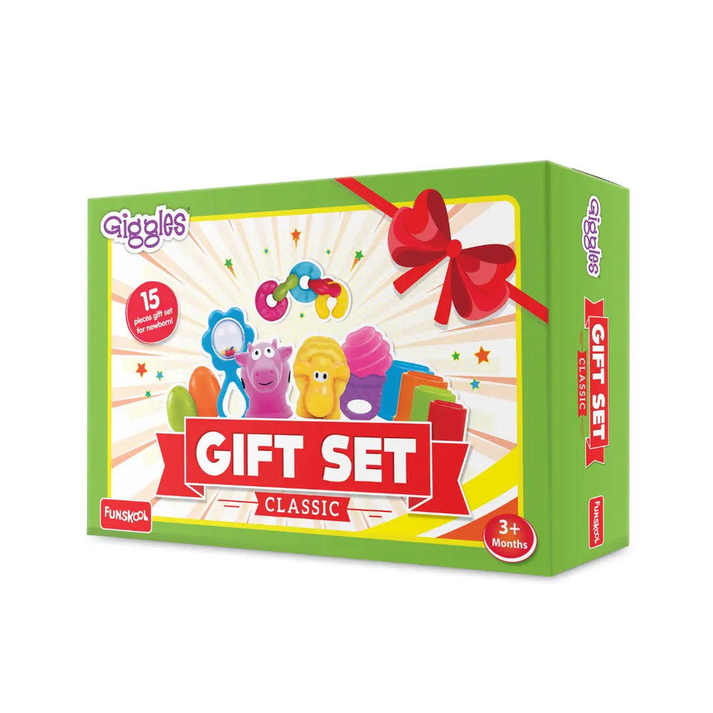 Gift Set Classic engages the attention of the baby and ensures early development with a set of 15 toys ranging from rattles to teethers, squeakers to linking toys, and more. Designed in eye-catching, vivid colours and in different shapes and sizes, the toys develop the baby's observation and motor skills. Includes: Teether, Rattle, squeakers, drums, chain links, Nesting eggs