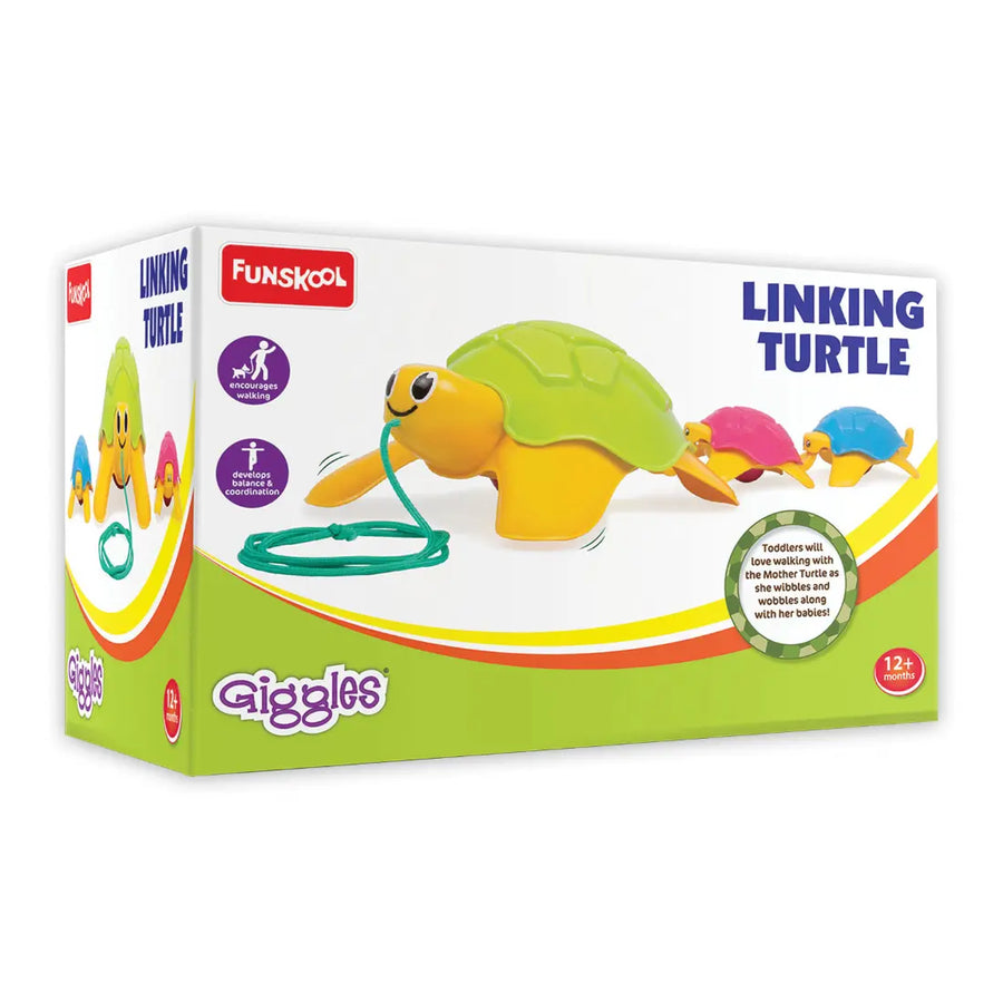 Linking turtle crawls leading her two adorable babies. Linking Turtles has been conceived for growing children to improve varied skills. The mama turtle can be taken apart and easily fixed together again by little hands. When checking for the bigger turtle they learn to identify size and colour. While fixing one to the other they hone motor skills. Be ready. Next time they see a live turtle they'll want to pet it for sure!