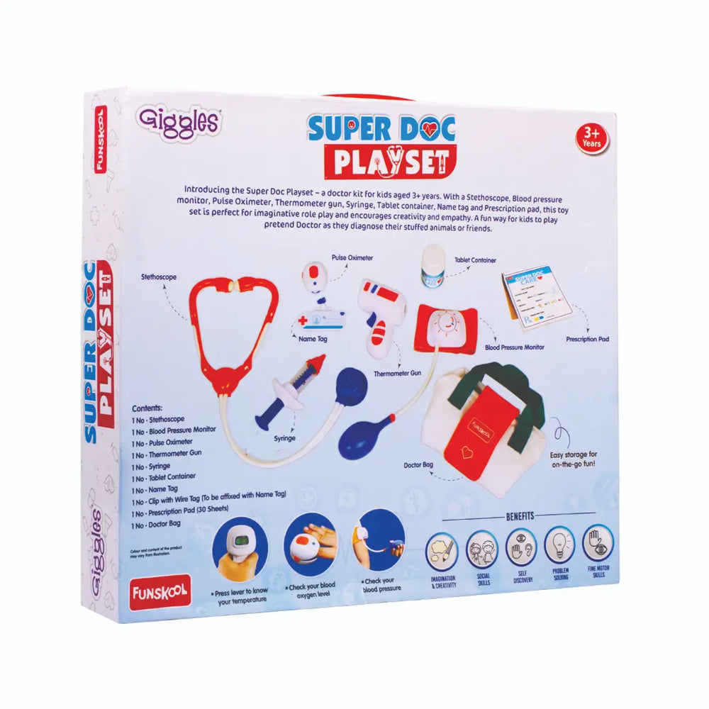 A Doctor kit for kids with a Stethoscope, Blood pressure monitor, Pulse Oximeter, Thermometer gun, Syringe, Tablet container, Name tag and Prescription pad, this toy set is perfect for imaginative role play and encourages creativity and empathy. A fun way for kids to play pretend Doctor as they diagnose their stuffed animals or friends