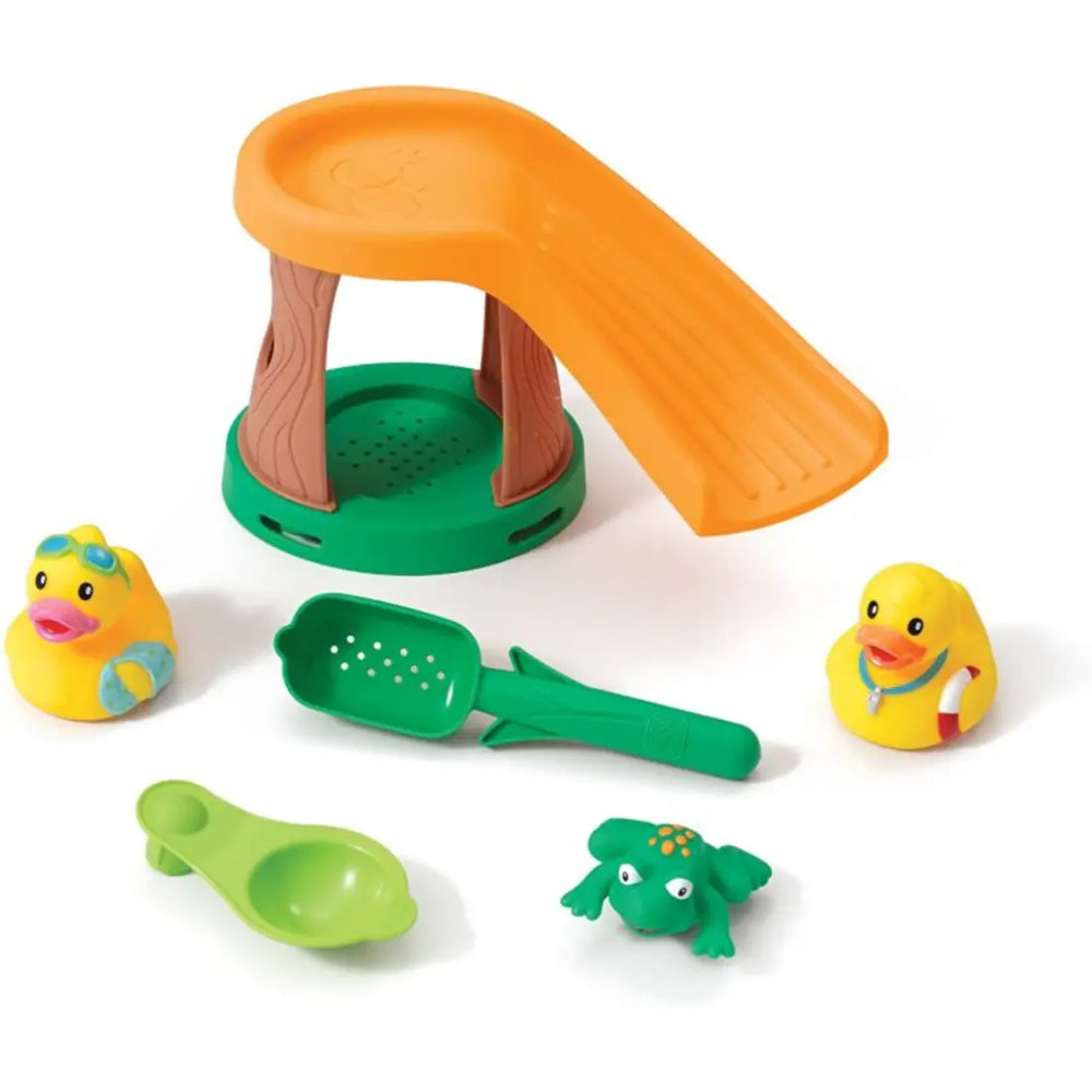 Send the ducks down the slide or leave them high and dry under the slide tower. Launch the frog off the side flipper and into the pond. Crank up the fun by turning the center spinner and getting the water flowing.