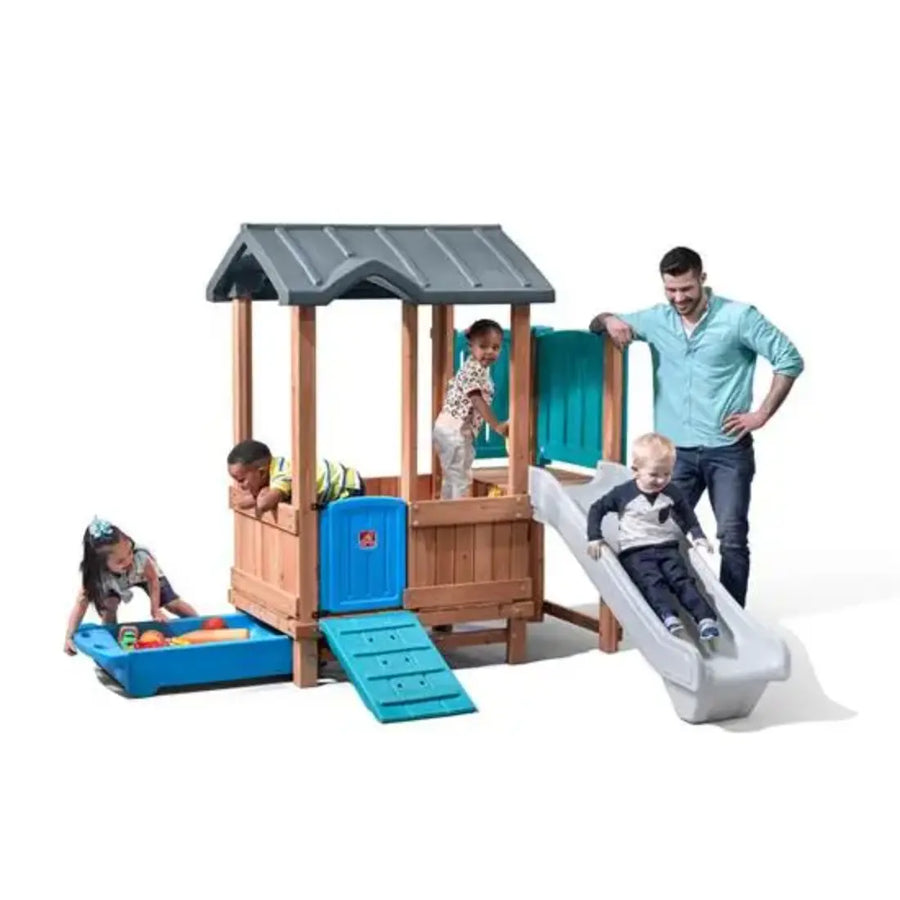The possibilities are endless with this charming kids playhouse and slide! It can be a castle, a cottage, a pirate ship, or anything they want to imagine! This stylish backyard play set uses mixed materials for a unique look. The primarily wood construction creates a classic look. Colorful plastic components are kid-friendly and hold up to hours of play! This wood and plastic playhouse will let little ones play the day away!