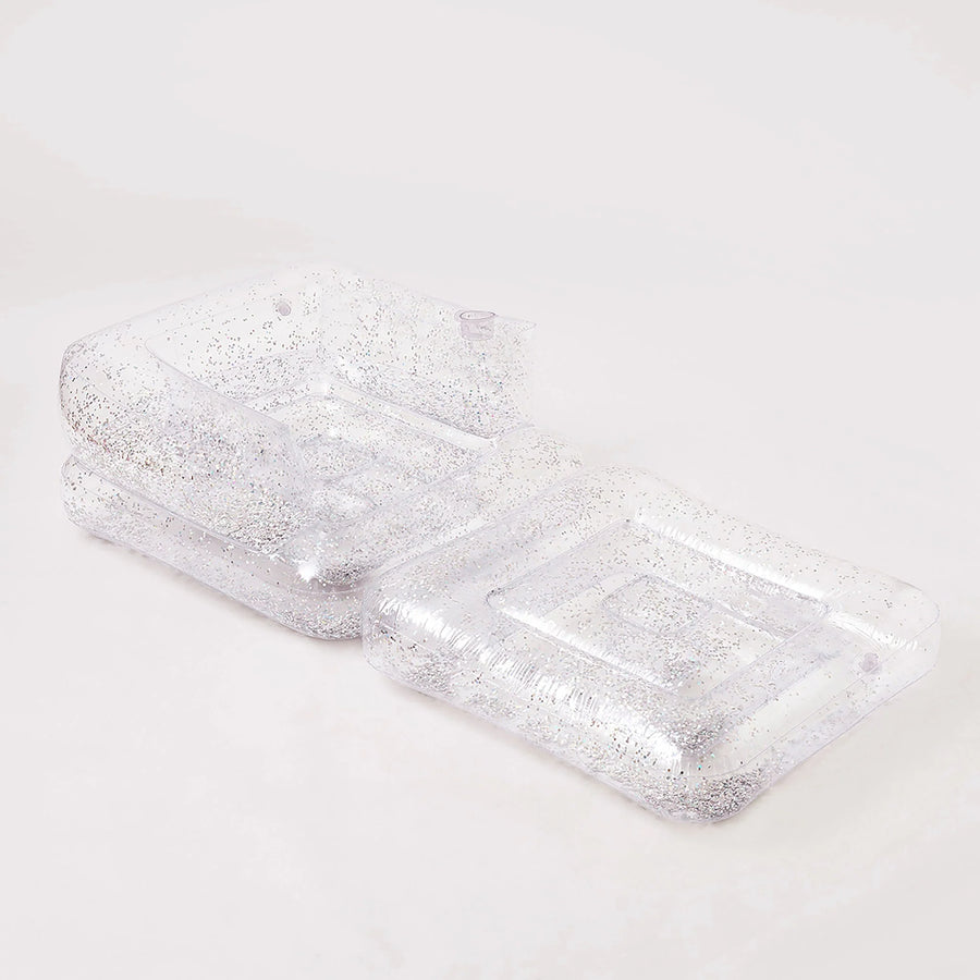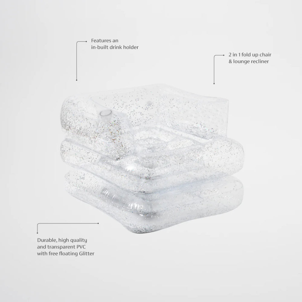 Enhance your summer relaxation with the Glitter Inflatable Lilo Chair from SUNNYLiFE. This chic, multi-functional chair transitions seamlessly from a comfortable floating chair to a luxurious recliner. Part of our exclusive Glitter Collection, it’s designed to add a touch of glamour to your pool time with its transparent material filled with silver holographic confetti that sparkles beautifully in the sunlight.