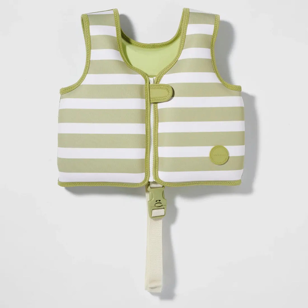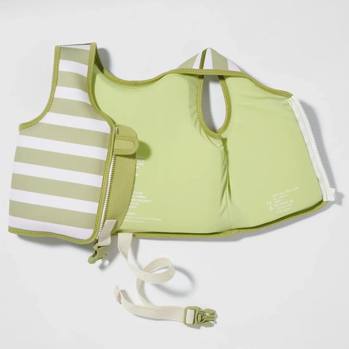 From paddling to pro, boost kids swim confidence. The Into The Wild Swim Vest 2-3 is cute, practical, and comfortable and will be sure to make a splash wherever you go. Made from durable neoprene for buoyancy and warmth, simply zip the vest up from the front and secure the safety strap between the legs for a snug fit. Little ones will love the freedom this swim accessory offers them, from swimming to playing and building confidence in the water. Turn heads and ensure this season is one to remember with its trendy maxi stripe print, sharp scaled backbone, and cool khaki and cream colourway. Suitable for children aged 2-3 years old.