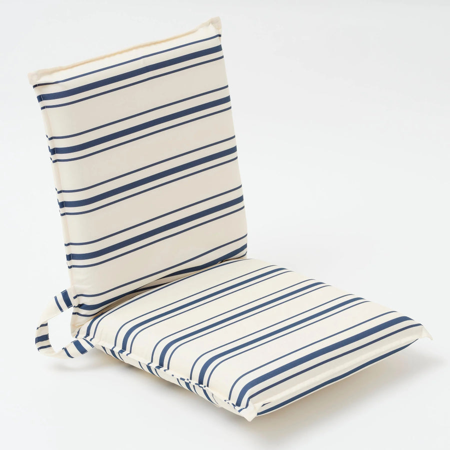 Enhance your beach experience with the Resort Lean Back Beach Chair, a must-have for serious sunbathers. Designed to accommodate all preferences, this chair offers six adjustable settings allowing you to sit up, lean back, or fully recline. Crafted with a removable, water and fade-resistant cover, this lightweight chair combines durability with style, featuring vintage stripes and a nautical color scheme that appeal to the modern beachgoer.