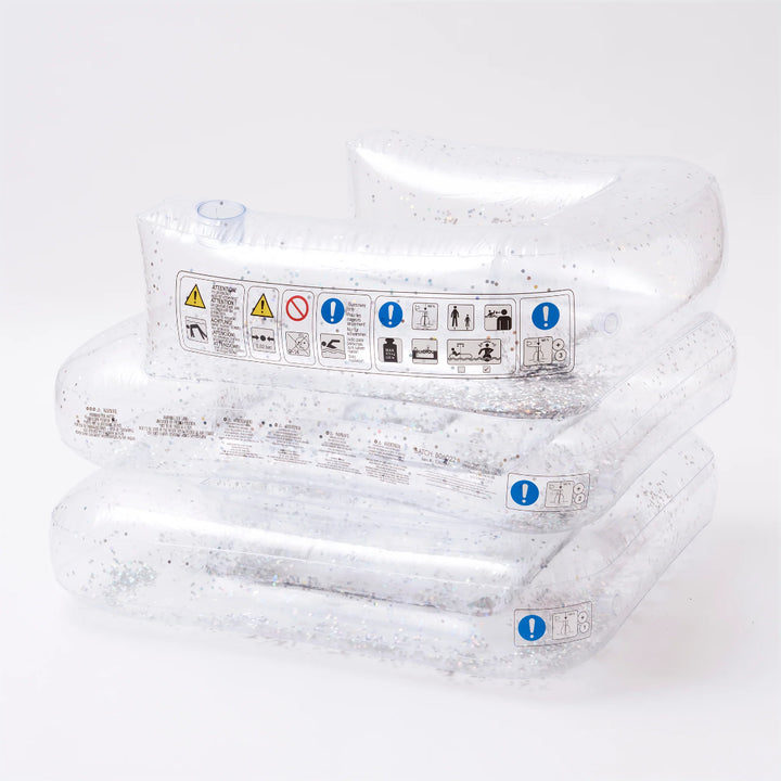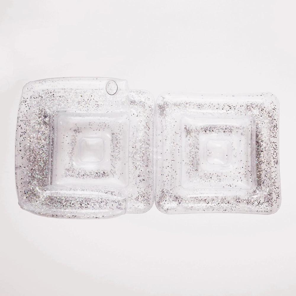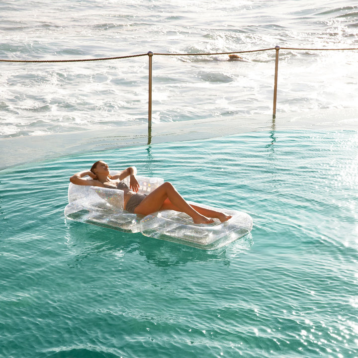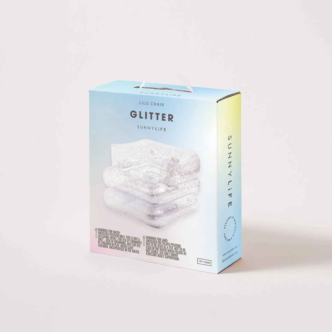 Relax and add a sparkle to your summer with the SUNNYLiFE Glitter Inflatable Lilo Chair. This dual-function chair serves as both a comfortable floating chair and a relaxing recliner. Part of the dazzling Glitter Collection, it's filled with silver holographic confetti, making it a shimmering addition to your pool accessories.