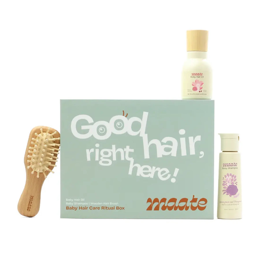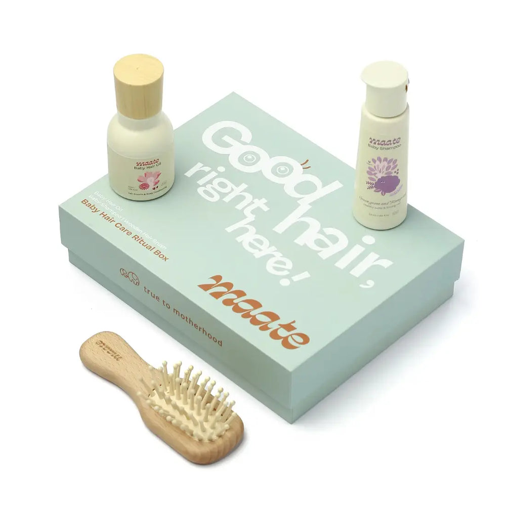 Embark on the journey of lush baby hair with the Maate Baby Hair Care Ritual Box! This box contains all you need for nourished and healthy baby hair. Establish a daily ritual of warm baby hair oil massage, followed by a mild hair rinse using natural baby shampoo, and a gentle brushing routine with the included baby wooden hair brush for delicate scalp stimulation.