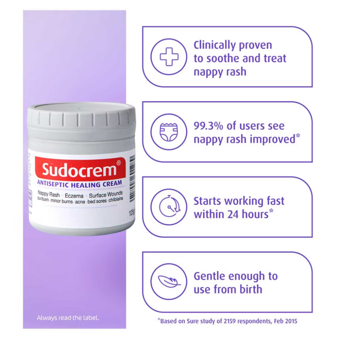 Sudocrem Antiseptic Healing Cream provides gentle protection and relief for sensitive skin. Its soothing formula helps prevent diaper rash, calms irritation, and promotes natural skin healing.