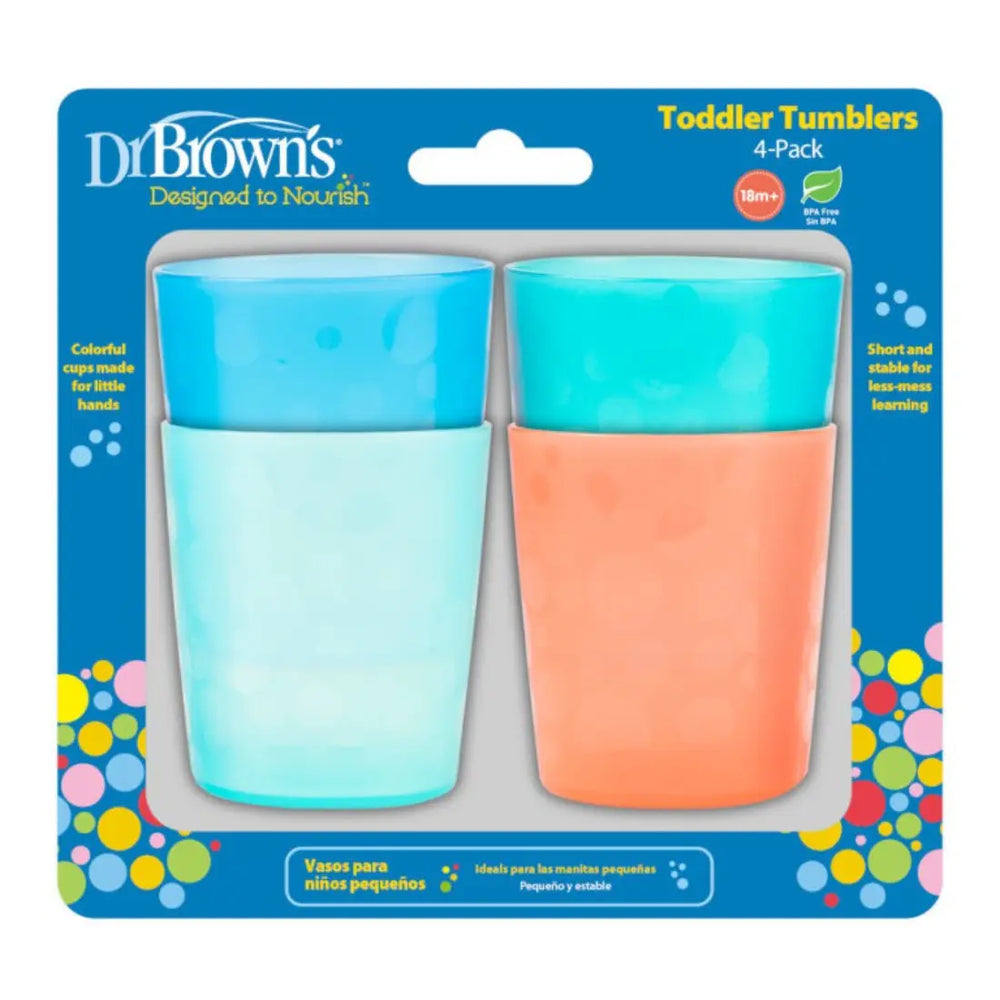 Make transitioning to a big kid cup easier for your toddler with the Toddler Cup. Its short design allows for pint-sized sipping, while the wider and stable base prevents tipping, reducing mess. This set includes four colorful toddler cups in light turquoise, dark turquoise, coral, and blue. They are dishwasher safe (top rack) and BPA free, making them safe and convenient for everyday use.