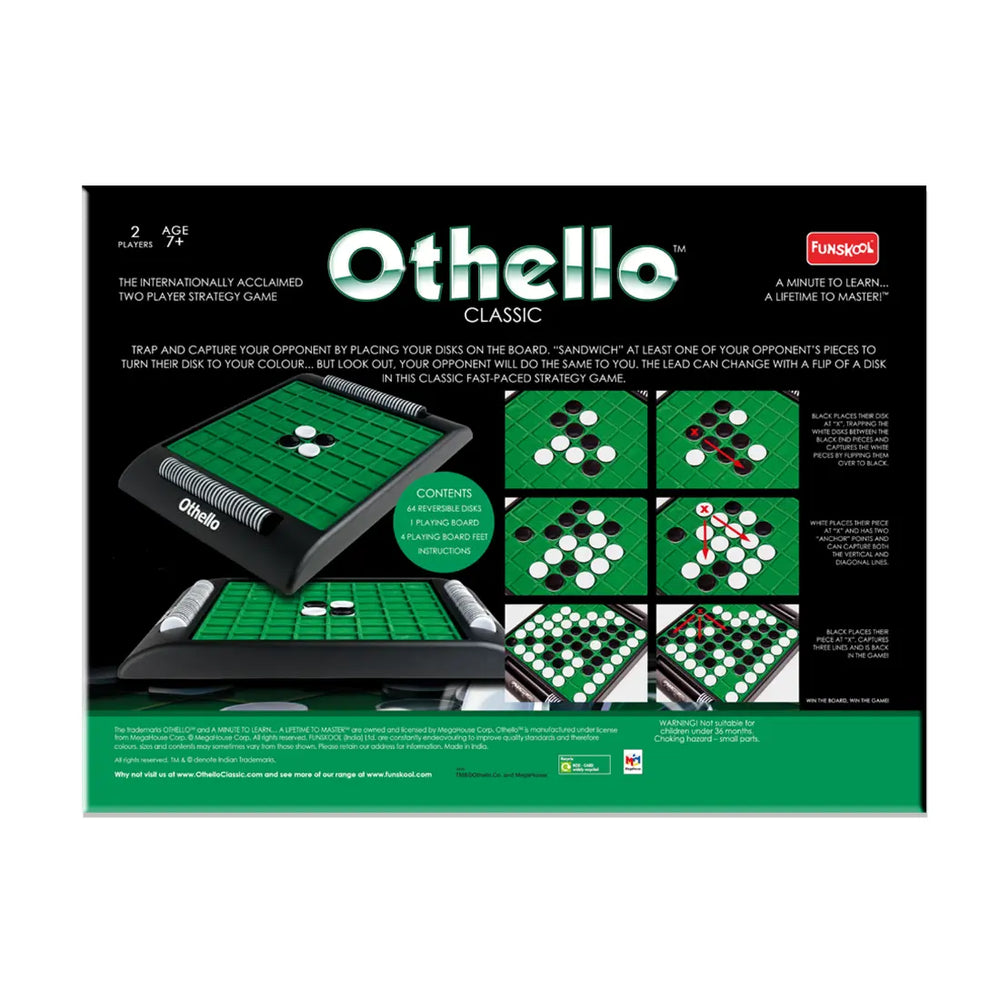 A Minute To Learn, A Lifetime To Master! Othello is a game where not all is Black and White. The lead can change hands from play to play and strategy is everything. The play is simple. Players are represented by either Black or White discs on the board. On each turn, players flank the discs of the opposing player between two of their own. Once captured, the double-sided discs are turned over and become the opposite color. If you have a move, you have to take it whether you want to or not. That's all, that's the entire game. But more and more discs fall to the opposing side with each turn. Where will it all end? Starting from just four discs to begin the game, play moves all over the board with as many as 64 discs placed by the final move. Play can end when one player can't make any more moves OR when the board is full. To add to the fun, if you can make a move but you're out of discs, your opponent has to give you one of theirs. That's like arming the enemy! As you become more and more familiar with Othello, certain strategies will begin to emerge. Owning a corner is always an advantage as that protects your discs in the immediate vicinity - your opponent can't outflank you. But is your opponent backing you towards a corner so they can try to control it themselves? That's the strategy of Othello. Can you see enough moves ahead to make your opponent put a disc somewhere they don't want to? A minute to learn...a lifetime to master!