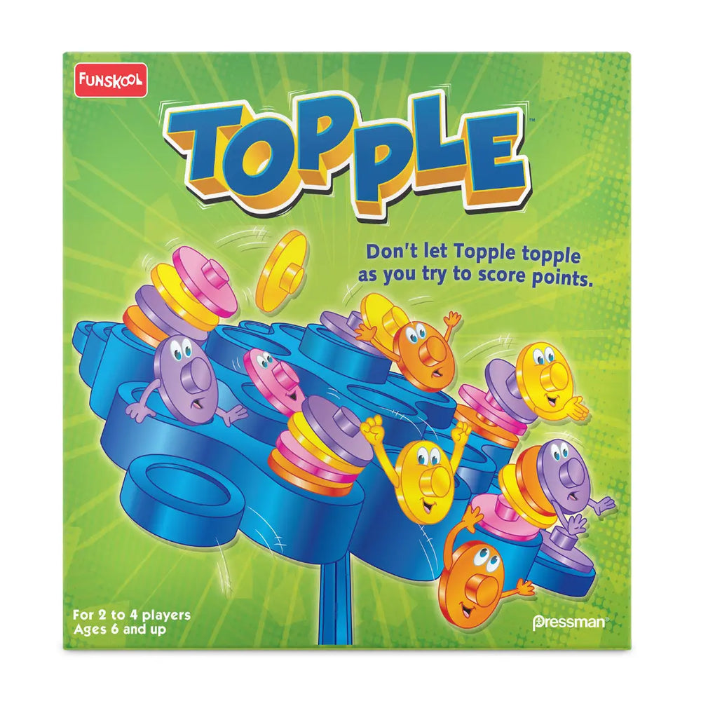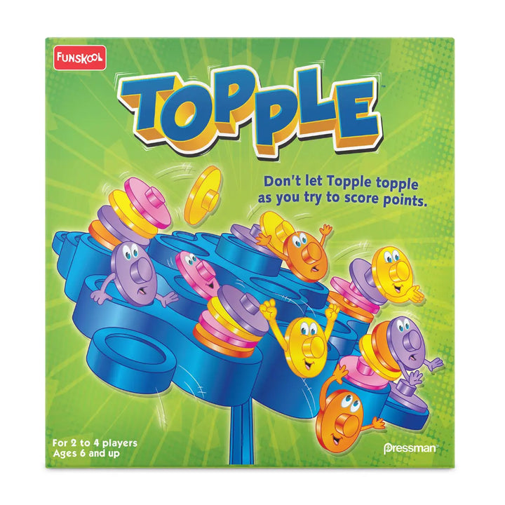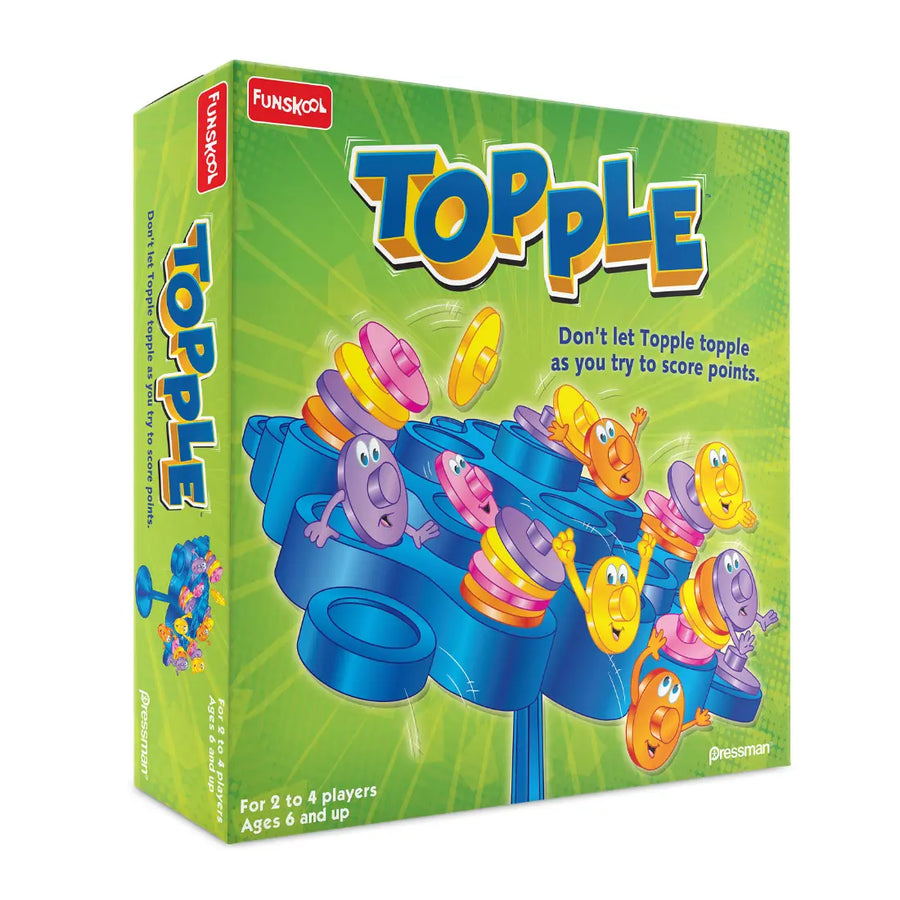 Construct undeterred towers with Funskool Topple Board Game. Roll the die and place the pieces on different levels of the board. Watch out! As more pieces are added to the tower, it starts to turn, tip, and sway, which means a higher risk of toppling them down. The player completing a row of five and managing to add to existing rows or stacking them high (4 or more) is the winner.