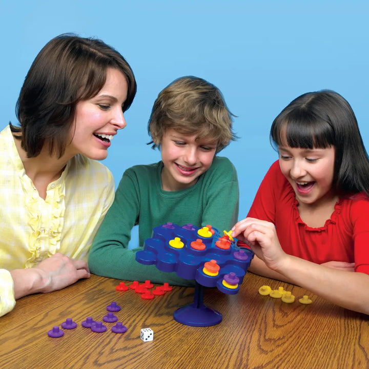 - Includes game base, game dice, topple tower, 48 playing pieces, and a game stem