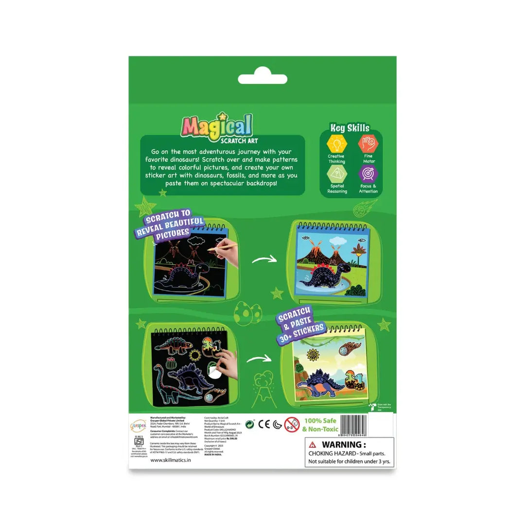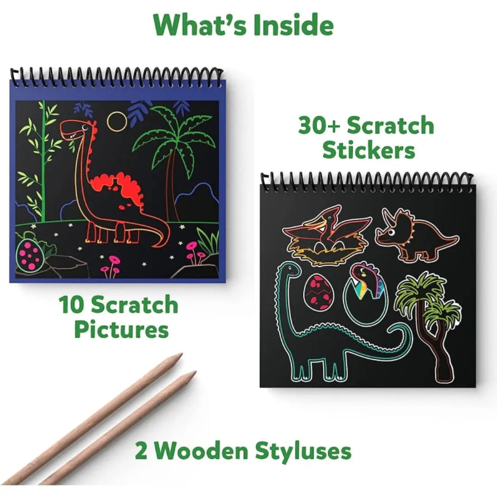 Bring dinosaur adventures to life with the Scratch Art Dinosaur Kit! This exciting activity lets kids reveal vibrant dinosaur images by drawing and scratching over them. They can enhance their creations by adding unique scratch-art stickers featuring dinosaurs, fossils, and more.