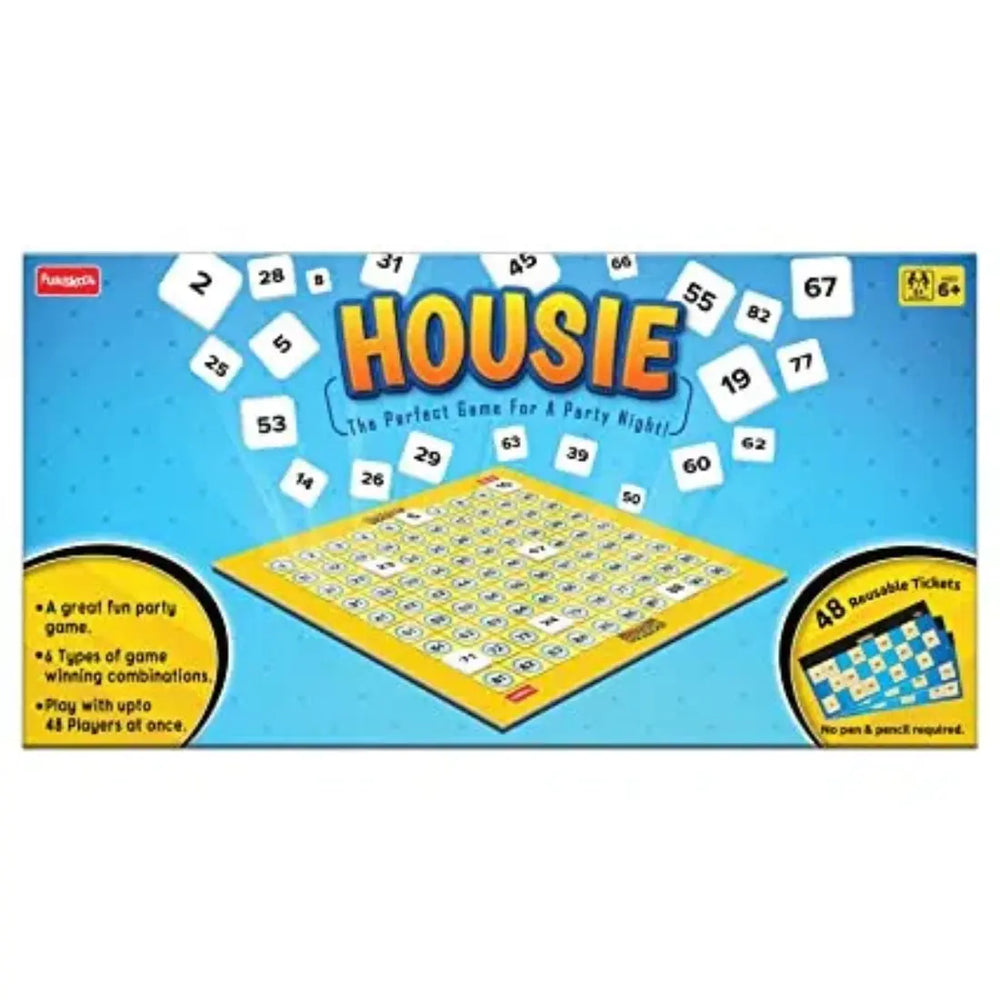 HOUSIE - The Perfect Game for a Party Night! A simple and engaging game that can be played in multiple ways for any occasion. Game Play: Give each player a Housie Ticket(s). The Host calls out a number. The players check if the number called is on their ticket, if yes, they fold that number. The first player who folds all the called out numbers on their ticket is the winner.