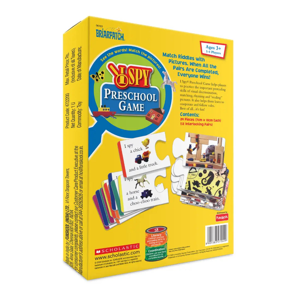 The I Spy Preschool Game is the self-correcting matching game where players match riddles with pictures. When all the pairs are completed everyone wins. Beginners "read" the pictures and advanced players read the words. There are five ways to play, including a memory version. I Spy Preschool Game helps players to practice the important pre-reading skills of visual discrimination, matching, rhyming, and "reading" pictures. It also helps teach cooperation and how to follow rules. Contains 12 interlocking pairs and game rules.