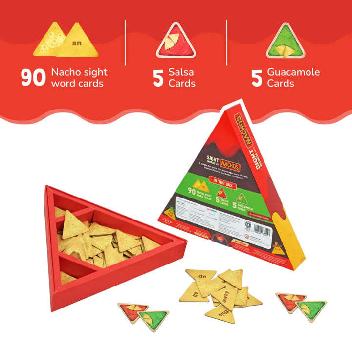 - IN THE BOX - 90 Nacho sight word cards, 5 Salsa cards, 5 Guacamole cards.