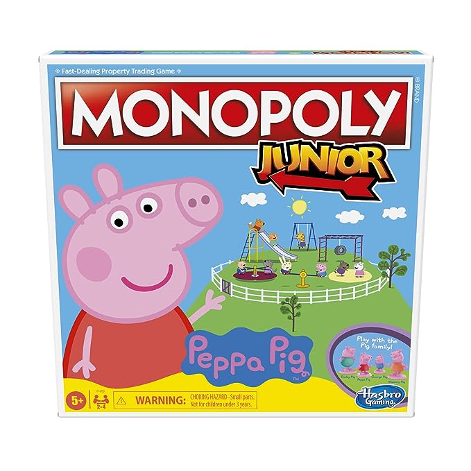 PEPPA PIG THEME: Learn to earn with Peppa and her family! In this Monopoly Junior board game, kids can imagine being part of the happy and fun world of Peppa Pig.