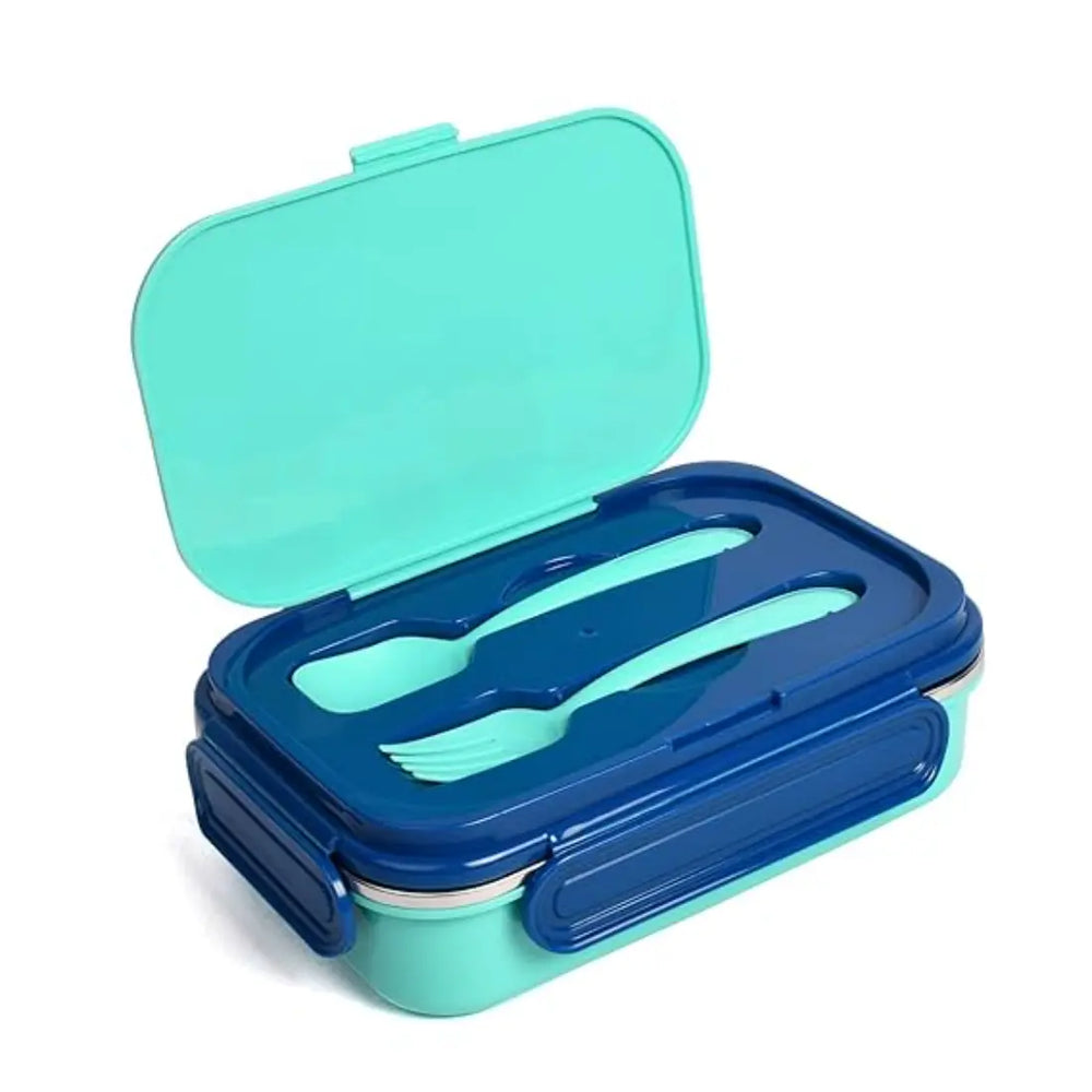 • Comes with a push-to-open upper panel that includes a spoon and fork inside.