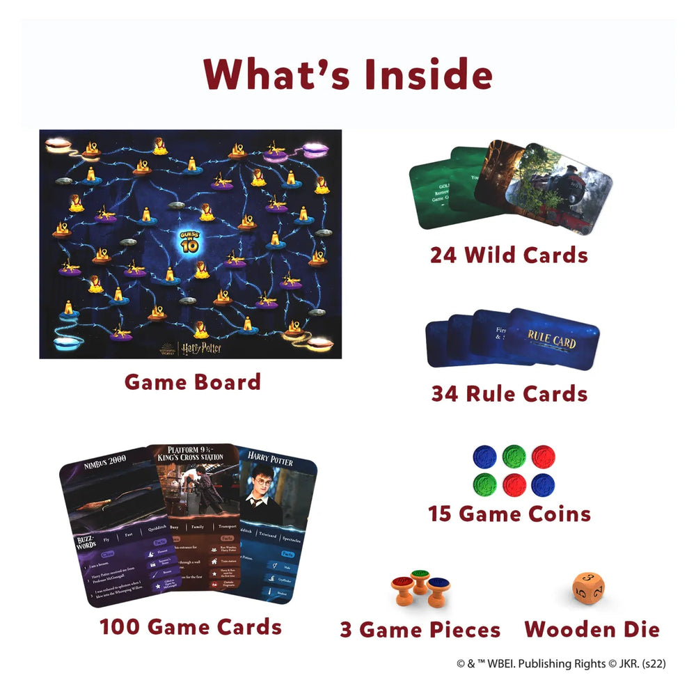Roll the die and travel to different locations around the board. Use up to 10 "yes" or "no" questions to identify Characters, Locations, Magical Creatures, and Artifacts from the Wizarding World. Secure your spots as you advance! Land on Wild Spots for thrilling challenges. Think carefully, ask intelligent questions, and be the first player to secure 5 spots to win!