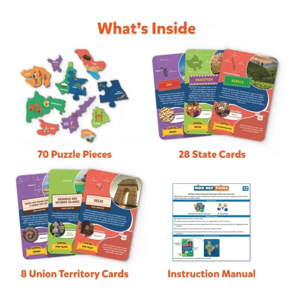 The India Map Puzzle offers a fun and educational experience for children aged 6-12, blending puzzle-solving with the exploration of India's diverse regions. With 70 high-quality puzzle pieces, this floor puzzle allows kids to piece together a detailed map of India, featuring color-coded states and Union territories for easy identification.
